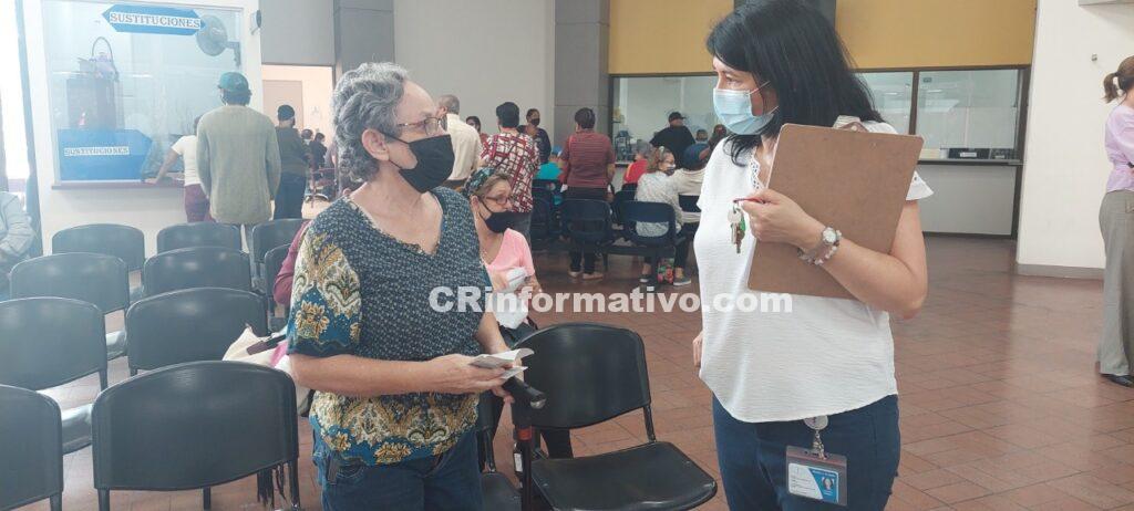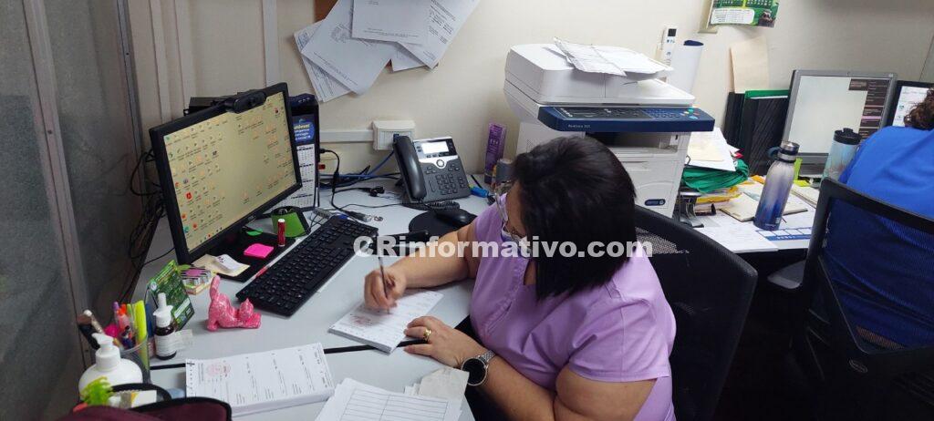 Al igual que el doctor Arley, en el CAIS Marcial Fallas en Desamparados está la doctora Blanca Velásquez Chaves, ella es la coordinadora del primer nivel de atención, y en este momento está en el vestíbulo principal guiando a los usuarios, ella les indica donde deben dirigirse, además coordina las filas, y está pendiente de los siete médicos que están realizando las recetas (tipo copia) manuales.