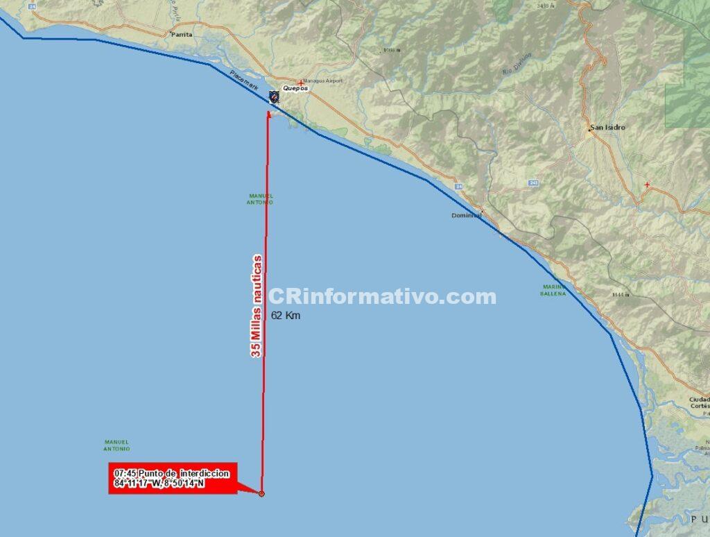 De acuerdo con lo reportado por el comisario Martín Arias, Viceministro de Seguridad Pública y director del Servicio Nacional de Guardacostas, a las 07:45 de esta mañana fue interceptada una embarcación a 35 millas náuticas (aproximadamente 62 kilómetros) de Quepos, Puntarenas.