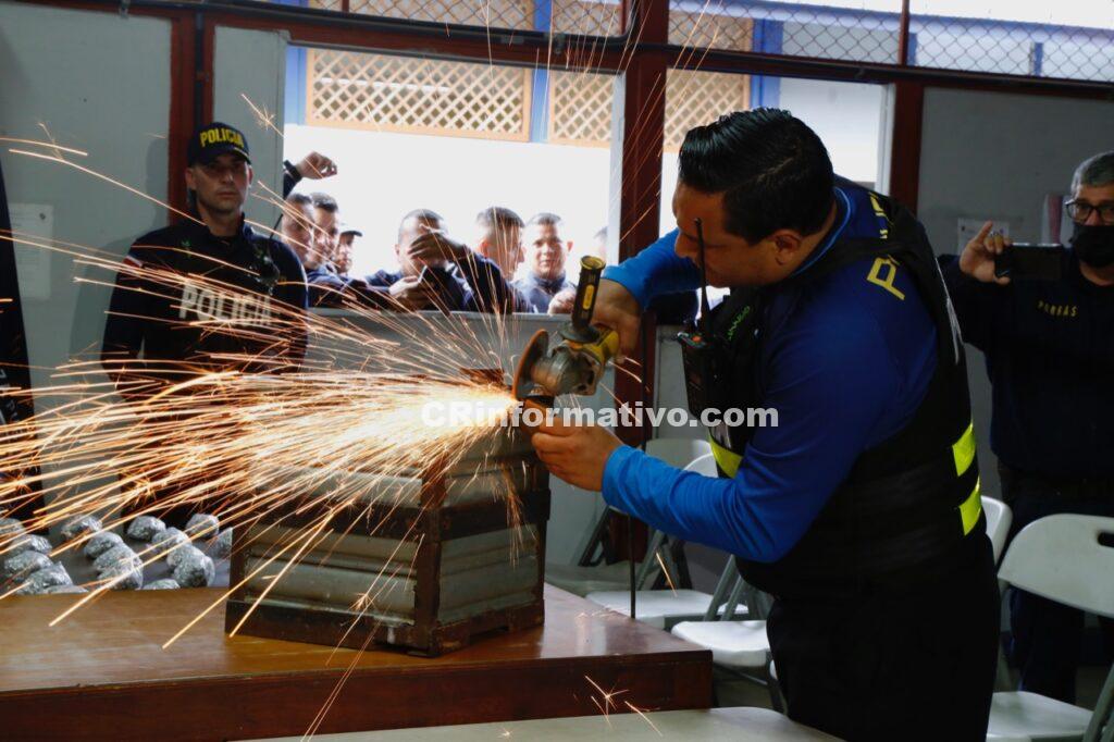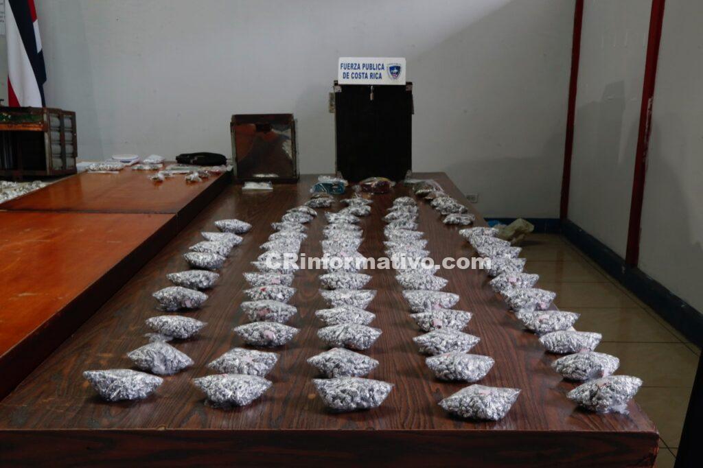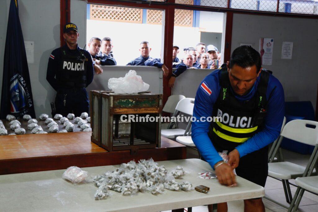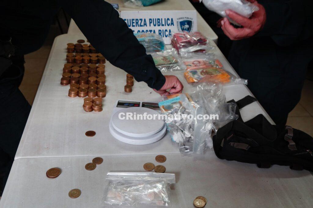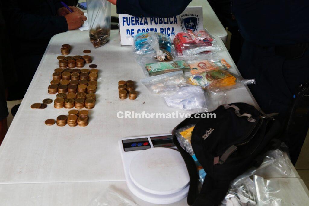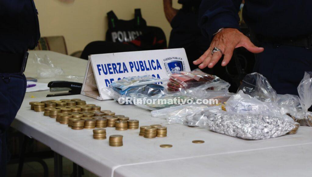 Al ingresar a la zona, la policía halló tres cajones tipo caja fuerte y dentro de ellos había drogas y dinero. En total: 6240 piedras de crack, 883 puchos de marihuana, 101 pajillas de cocaina, 20 dosis de cristal y 2.359.400 colones.