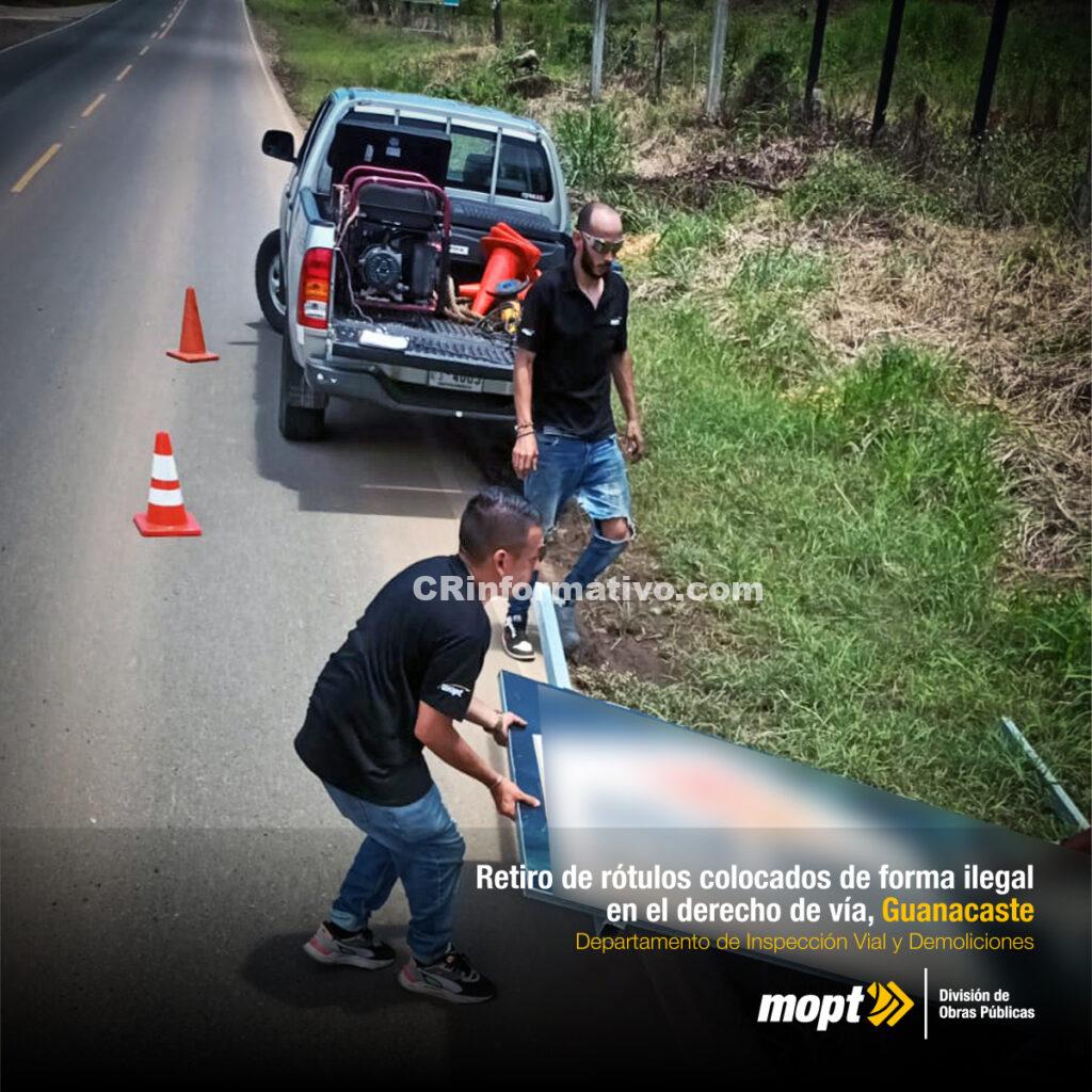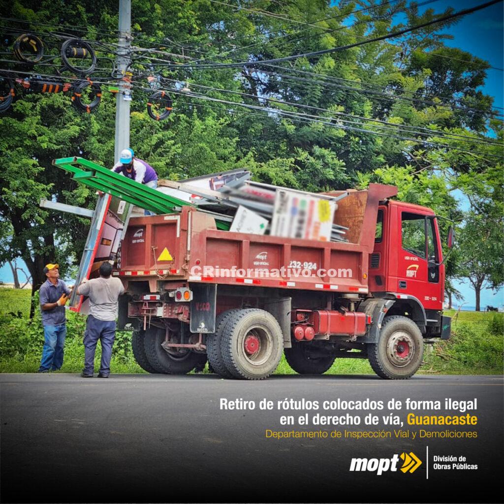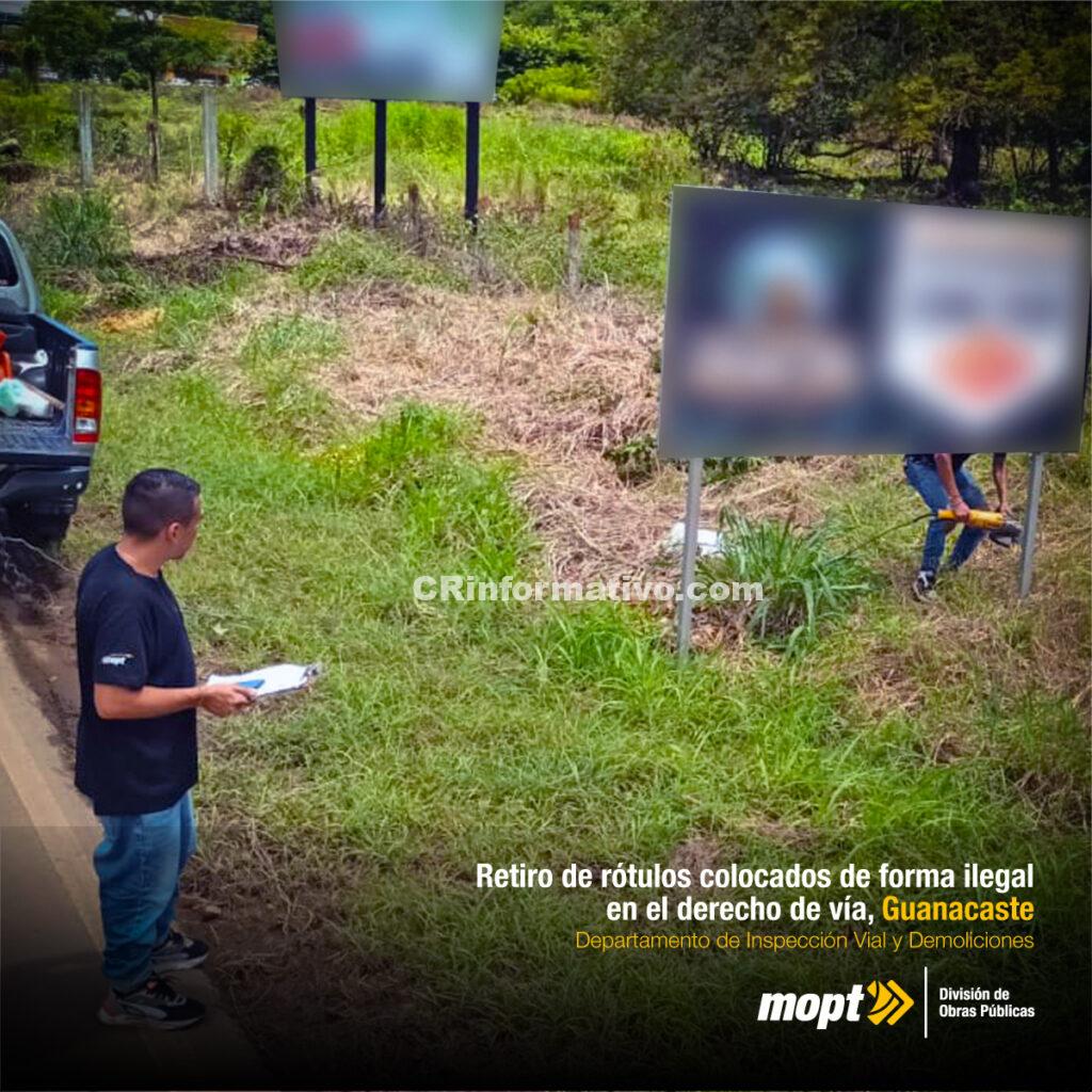 Más de 300 rótulos con publicidad que había sido colocada de manera ilegal en los derechos de vía del cantón de Santa Cruz, Guanacaste, han sido retirados esta semana por personal del departamento de Inspección Vial y Demoliciones del MOPT, que desde el lunes anterior recorren esta zona Guanacasteca.
