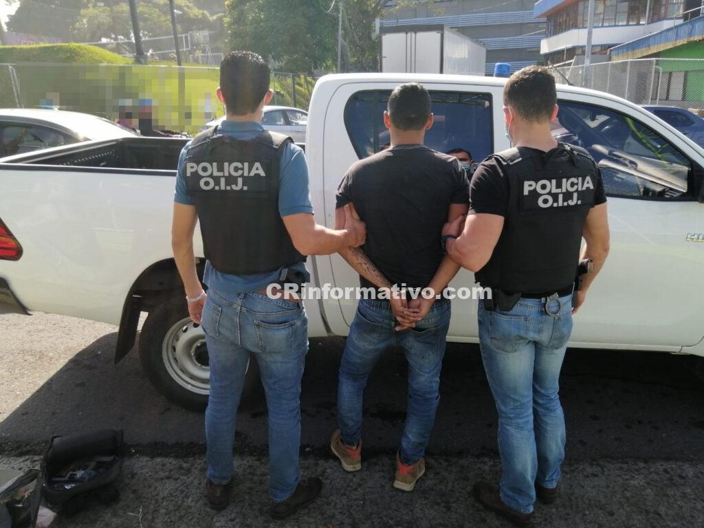 Los agentes de la Sección de Asaltos, por medio de las diligencias de investigación lograron identificar al sujeto detenido hoy como uno de los presuntos asaltantes, por lo que luego de una labor de inteligencia, con colaboración de oficiales del Ministerio de Seguridad Pública lo detuvieron cuando se bajó de un autobús proveniente de la zona atlántica en Barrio Tournón, en San José. Al momento de la detención se le decomisó un bolso en el que se encontraron dos armas de fuego tipo revolver.