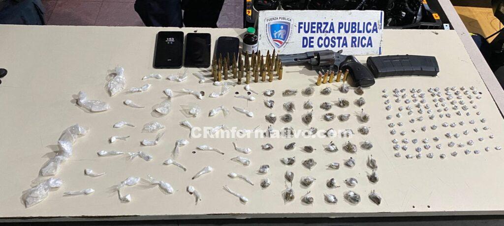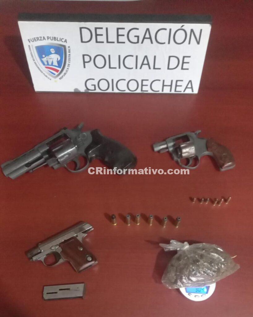 En Purral de Goicoechea, policías del Grupo de Apoyo Operacional (GAO) observaron a dos sujetos, uno de ellos estaba realizando disparos en vía pública, los policías los siguieron; sin embargo, estos huyeron por unos techos y dejaron botado en el sitio un revólver, 103 dosis de crack, 32 gramos de pasta de crack, 38 dosis de cocaína, 47 dosis de marihuana, un frasco de ketanol y un cargador con 32 municiones calibre 5.56.