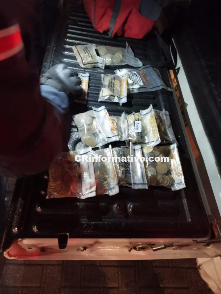 Los policías hallaron un maletín rojo con gran cantidad de monedas, las cuales sumaron 114 mil colones, cuando le realizaron la requisa al detenido, quien es de apellido Matarrita, de 37 años de edad, se le encontró entre sus medias un total de 91 mil colones en billetes de mil y dos mil.