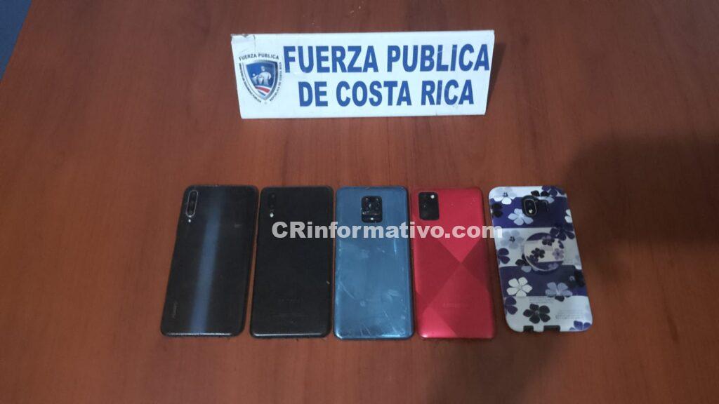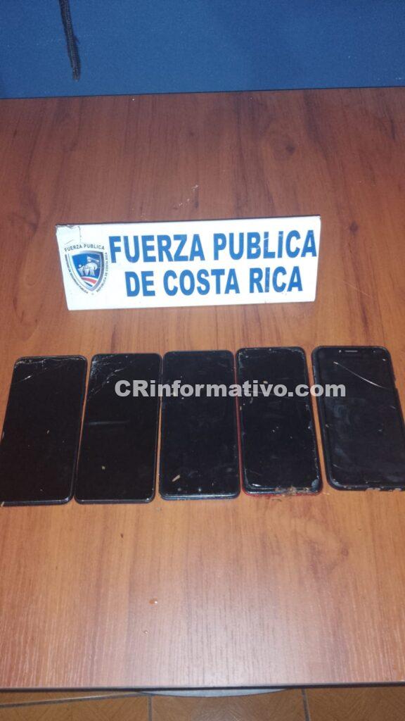 En otro hecho presentado ayer en la noche, oficiales de la Fuerza Pública destacados en la delegación de Fortuna, San Carlos, detuvieron a un hombre de apellido Ulloa, al que se le encontraron cinco celulares que aparentemente robó junto a otro sujeto en asaltos cometidos a bordo de una motocicleta en varios puntos del cantón.