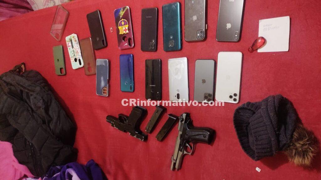 Se coordina y se recupera dinero efectivo y los celulares y les decomisan dos armas de fuego y un pasamontañas.