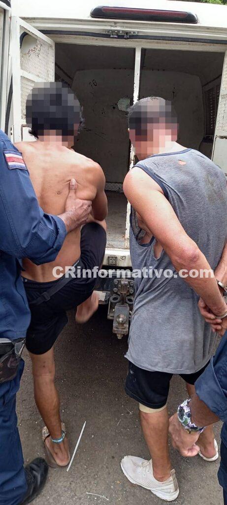 Luego de una búsqueda por los alrededores, los oficiales de la Fuerza Pública los detuvieron cuando huían por un charral, para lo cual tuvieron que realizar varios disparos de advertencia, pues los sujetos amenazaron con herir a los oficiales con un cuchillo, además de enfrentarse a ellos a puntapiés.