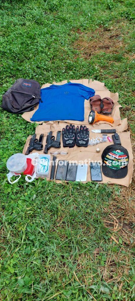 En total, junto con la Policía Judicial, las autoridades decomisan en la escena de la detención un bolso con dos armas calibre 9 mm con 17 proyectiles de la empresa de seguridad de los empleados del plantel, cuatro celulares, un black yac, un puñal, monedas y los chalecos de la misma empresa que quedaron uno en cada motocicleta.