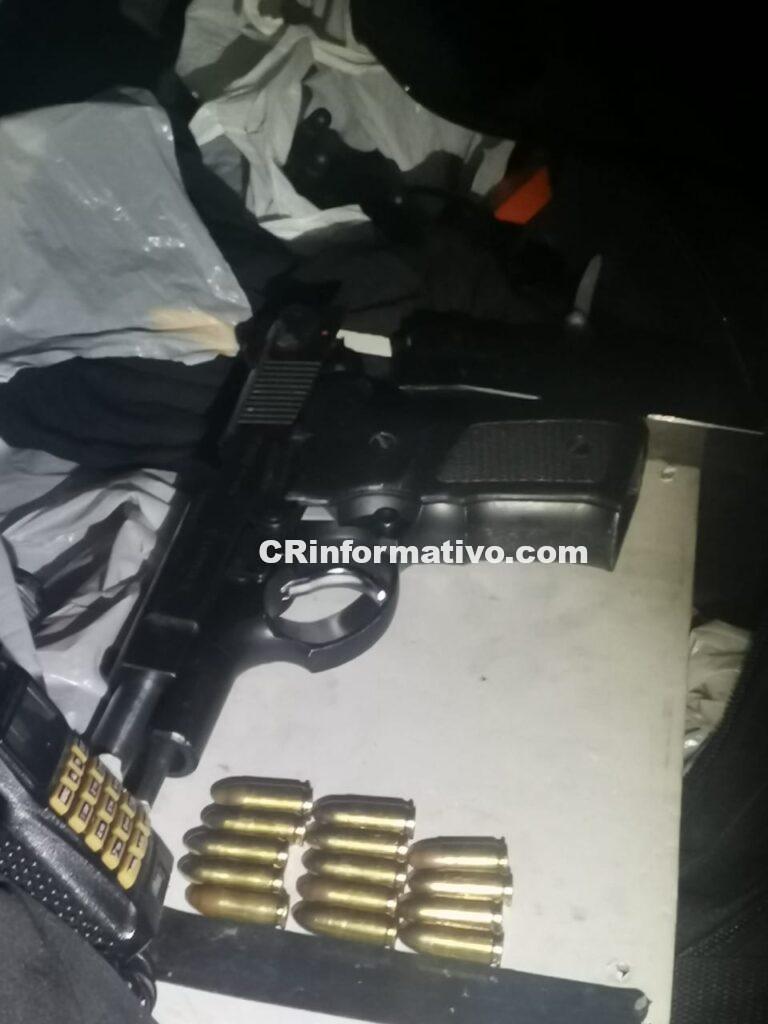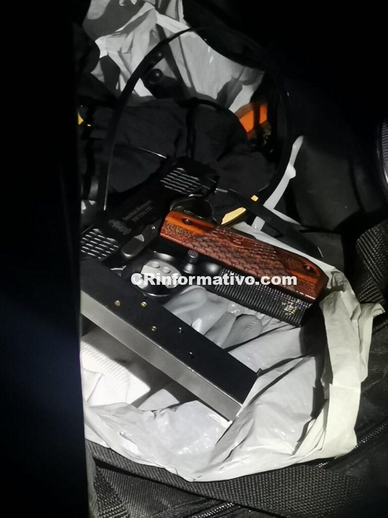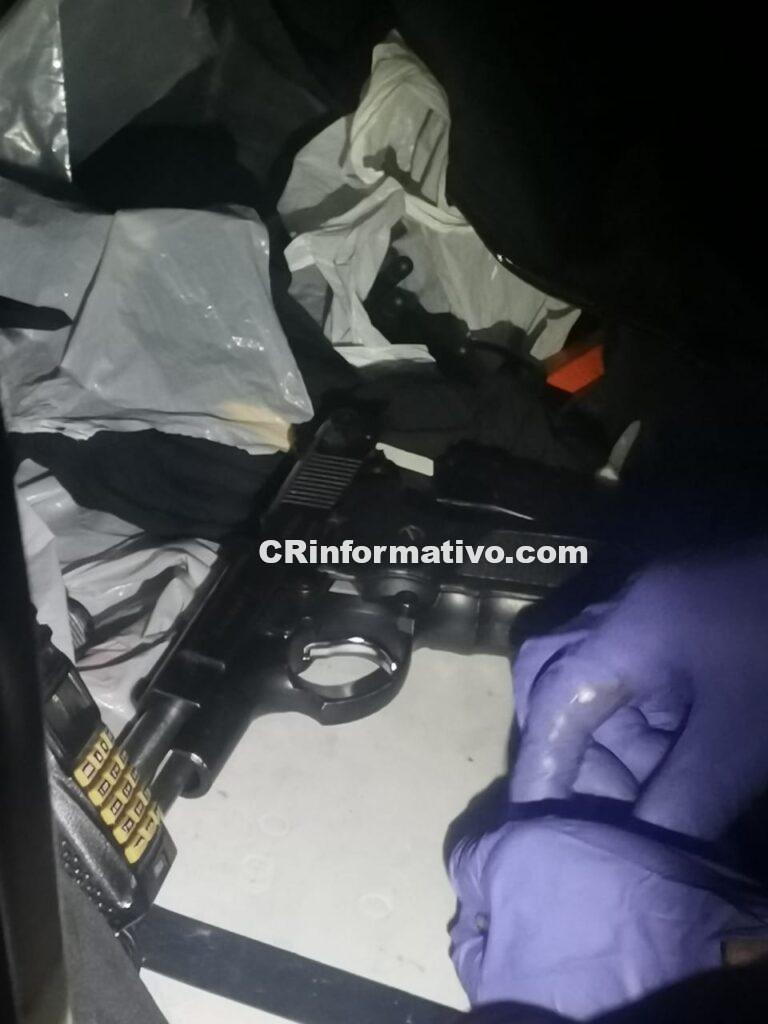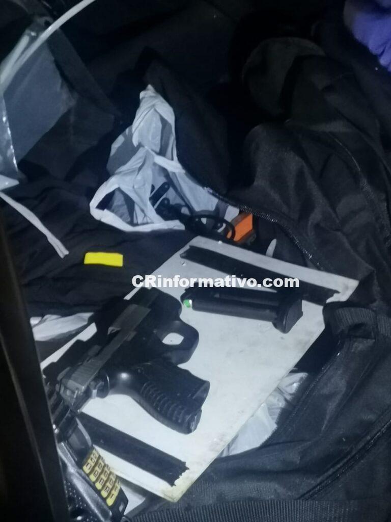 Al ser abordado, salió un fuerte olor a marihuana y desde afuera, se observó que en el lado del acompañante llevaba un bolso de tela y al iluminar con linterna desde afuera se ve que transportaba varios chalecos antibalas, pasamontañas y armas de fuego sin permiso de portación ni matrícula.