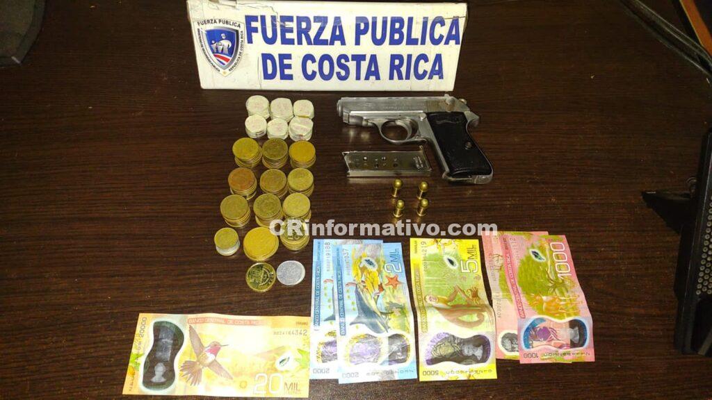 Varias unidades policiales acudieron al lugar y tras un rastreo por la zona, lograron dar con los hombres quienes portaban un maletín con dinero en efectivo, principalmente en monedas, un arma de fuego y varias municiones.