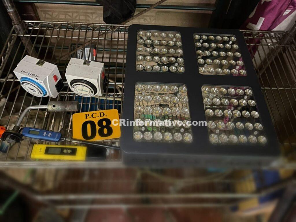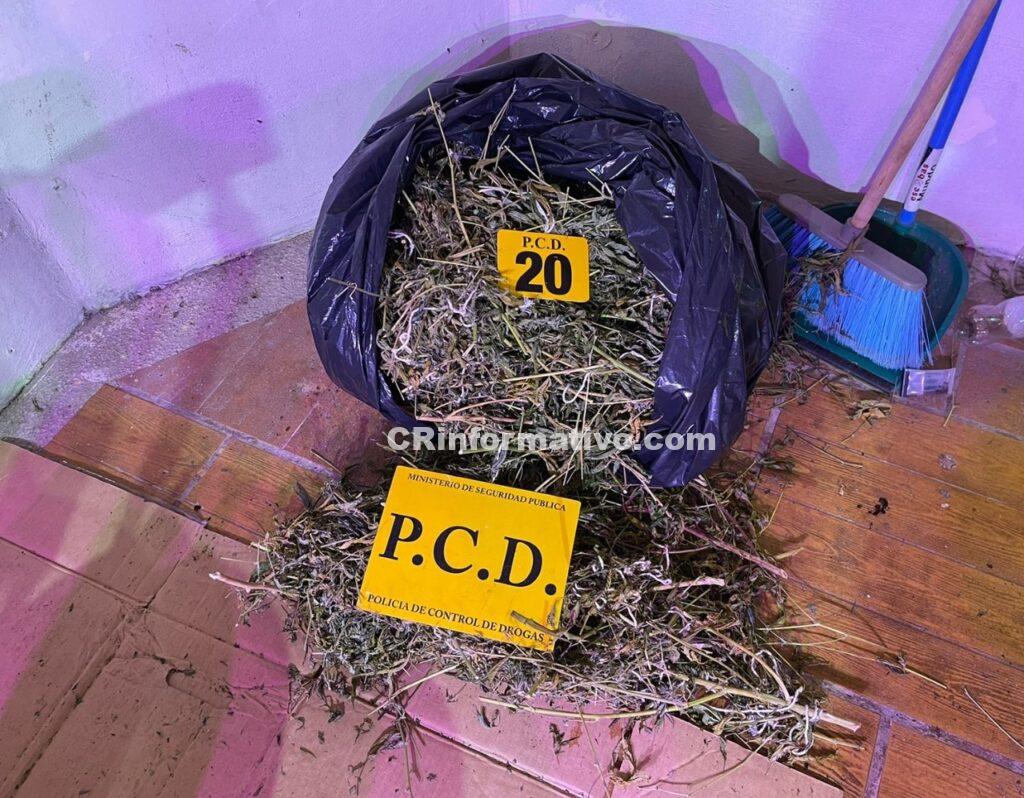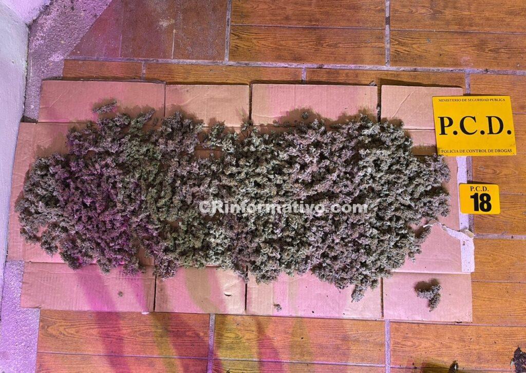 En esta operación antidrogas, los investigadores de la PCD decomisaron en marihuana un total de 1.038 dosis, 132 plantas con una altura de hasta 155 centímetros y cinco dosis de capullos, además 66.000 colones, 50 dólares, residuos de marihuana, gran cantidad de artículos con los que se componía el laboratorio e implementos para almacenar y distribuir la droga.