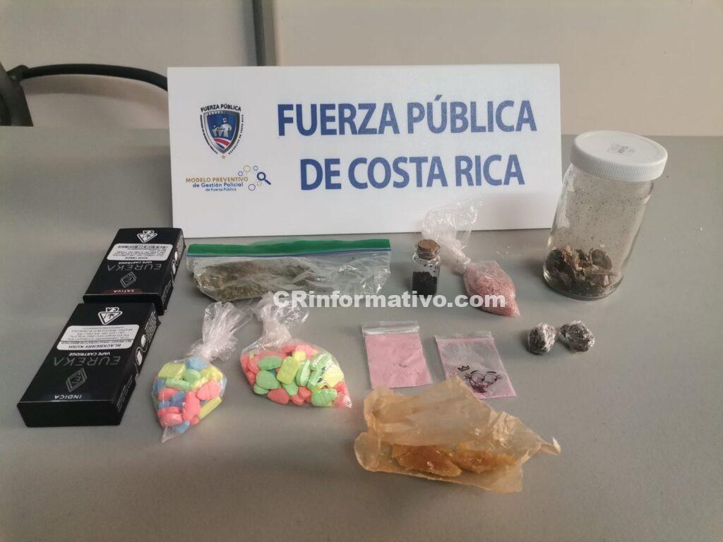 En total les decomisaron: 89 pastillas extasis, dos puchos de marihuana, 5,38 gramos marihuana, 7,22 gramos de cristal, 3,34 gramos marihuana en pasta, un frasco con aparente droga sin identificar, un frasco con hongos, tres frascos con aceite de marihuana para vaporizador.