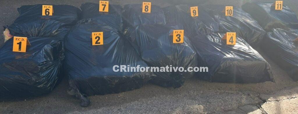 Siendo así, los investigadores de la PCD llegaron al sitio y llevaron a cabo las pesquisas correspondientes, determinado que en las bolsas negras con sacos se encontraba un total general de 274 kilogramos de aparente marihuana.