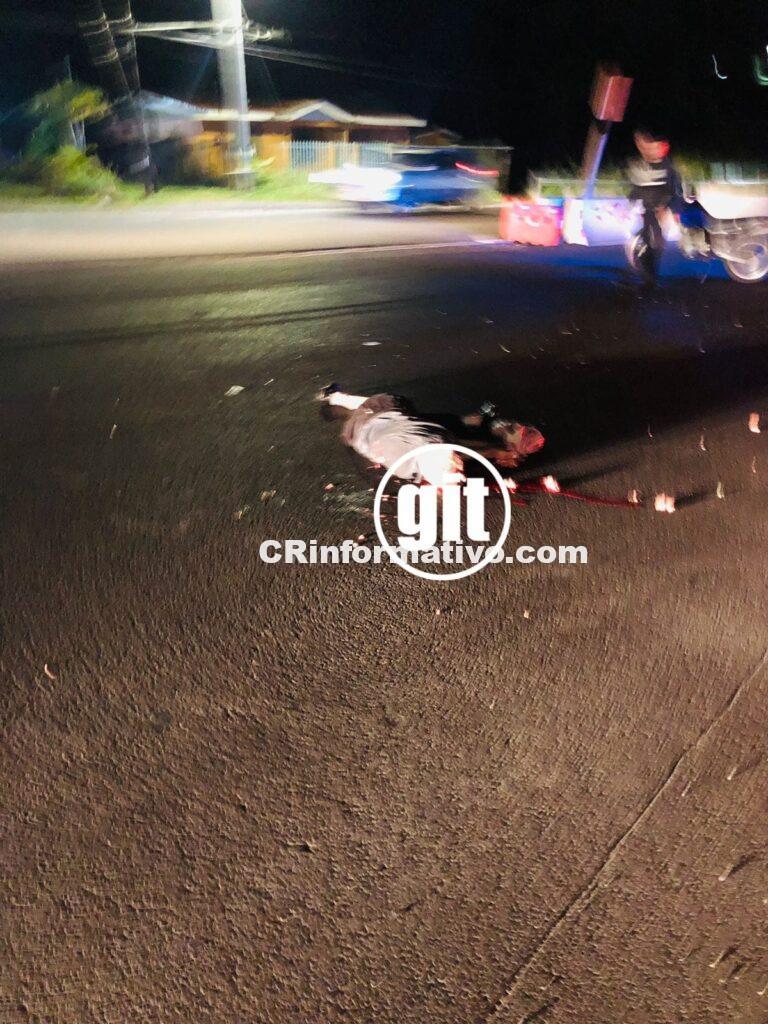 Reportan atropellado sobre ruta 32 antes de la antigua romana o frente al restaurante punto verde siquirres masculino de unos 65 años aproximadamente a lo que se cree podría tratarse de un extranjero ya que en el lugar se observa un tiquete aéreo y una tarjeta de un hotel donde podría estar hospedado en apariencia fue un vehículo pesado quien lo atropello dejándolo fallecido en el lugar
