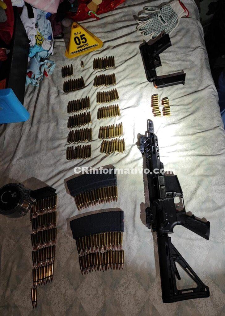 Hoy los agentes del OIJ de Limón realizaron tres allanamientos en Limón 2000, ahí se le detuvo al sospechoso y se le decomisó dos armas de fuego, una AR 15 y una pistola 380, una pistola 9 milímetros, cargadores y municiones para arma de fuego.
