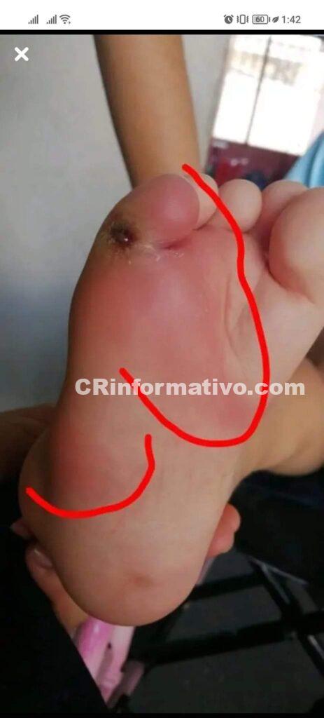 Yo fui lo deje a la escuela le explique a la maestra y le dije q si lo rojo se esparcia mas q me avisara, ratito después me llaman y me dicen q tiene el pie super hinchado y la calentura en 40, el papá fue lo recogió y decidí traerlo al hospital de niños.