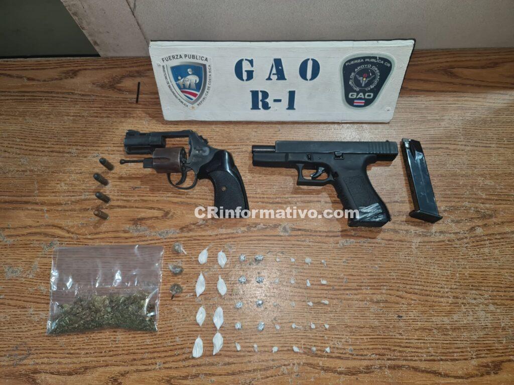 En una intervención realizada por oficiales del Grupo de Apoyo Operacional (GAO) en el distrito de San Rafael del cantón de Vázquez de Coronado, varios sujetos corrieron al notar la presencia policial, los policías realizaron un recorrido por una alameda y hallaron un bolso que contenía un arma de fuego, otra menos letal y varias dosis de drogas.