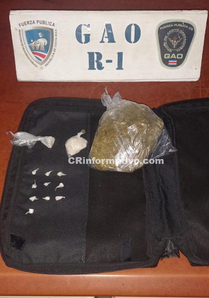 El GAO realizó un operativo en la Aurora de Alajuelita, en donde se logró la detención de un hombre de apellido Mendoza, el sujeto portaba un bolso en donde se ubicó 121 gramos de marihuana, 12 gramos de aparente pasta de cocaína y 10 dosis de crack. Fue remitido a la fiscalía.