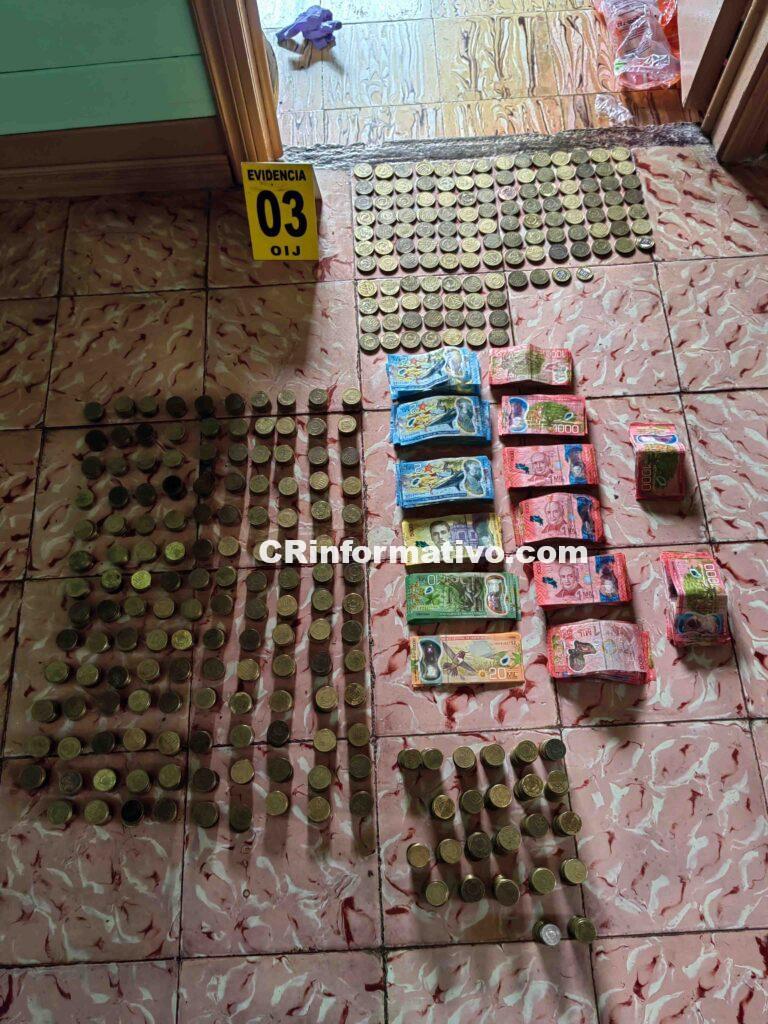 Durante la requisa del inmueble se logró la aprensión de los cuatro sospechosos y se decomisó alrededor de 2 millones de colones; un arma de fuego, municiones; droga tipo marihuana, pasta base de crack y cocaína; la vestimenta que al parecer utilizaron durante el asalto, así como varios documentos de los ofendidos.