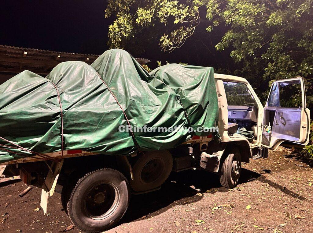Una vez realizadas las diligencias de investigación logramos interceptar dos camiones sospechosos que minutos antes habían salido de la propiedad. Un camión fue detenido en el cruce de Río Cajón, donde capturamos a dos personas, y el segundo camión frente a la plaza de deportes de Morazán de Atenas, también se realizó la captura de otras dos personas, uno de ellos menor de edad.