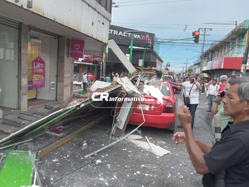 Por razones que están siendo investigadas, una parte de la estructura de las tiendas, específicamente los rótulos, se derrumbó y cayó sobre la vía pública, impactando también a un taxi que pasaba por el lugar.