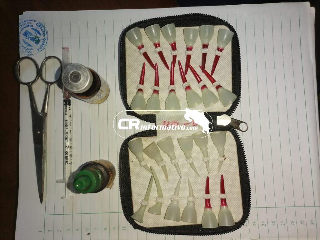 Los guardacostas también encontraron en la embarcación otros artículos relacionados con las peleas de gallos, como los son 105 espuelas y 16 zapatillas metálicas. De igual modo encontraron implementos usados para la corta de crestas a dichos animales, entre estos una jeringa, una tijera y un frasco con vitaminas.