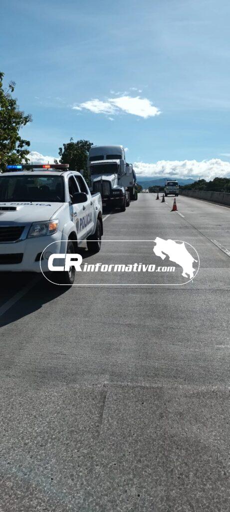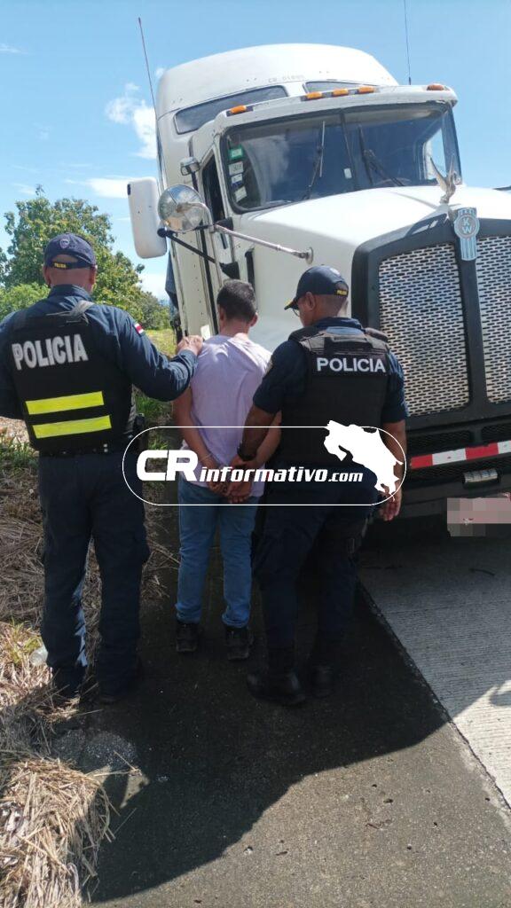 De inmediato, varios oficiales de la delegación policial de Cañas a bordo de unidades policiales comenzaron a tratar de ubicarlo, lo cual, dio frutos sobre la ruta Interamericana Norte, específicamente en el cantón de Bagaces, ahí se logró aprehender al sujeto que venía conduciendo el tráiler, de apellido Pérez, quien mantiene expediente judicial por robo agravado.