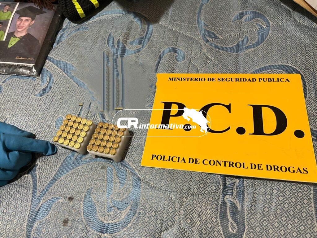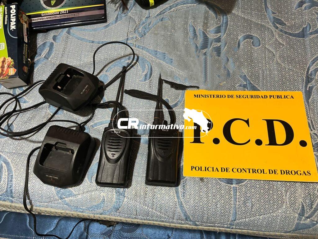 Dentro del inmueble allanado se decomisaron dosis de cocaína, marihuana y 370 gramos de crack, radios de comunicación, así como 80 municiones de distintos calibres y 157 mil colones en efectivo.