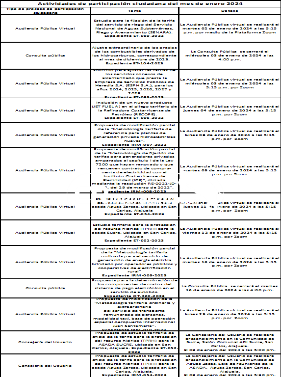 La Autoridad Reguladora de los Servicios Públicos (ARESEP) realizará 9 audiencias públicas en enero; así como dos consultas públicas y consejerías para las personas usuarias.