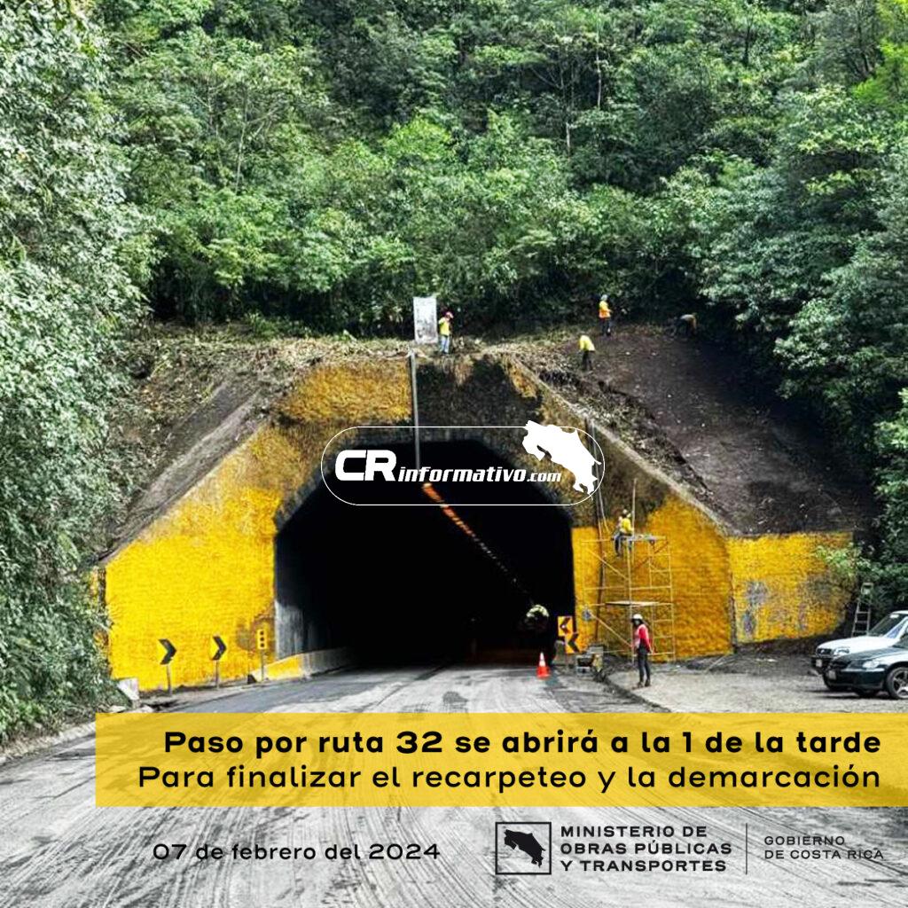 Con el objetivo de dejar demarcada la nueva superficie de ruedo en mezcla asfáltica, colocada entre el lunes y hoy en el túnel Zurquí, la apertura del tránsito por la ruta 32, Braulio Carrillo, se hará a la 1 de la tarde, una hora después de lo previsto.