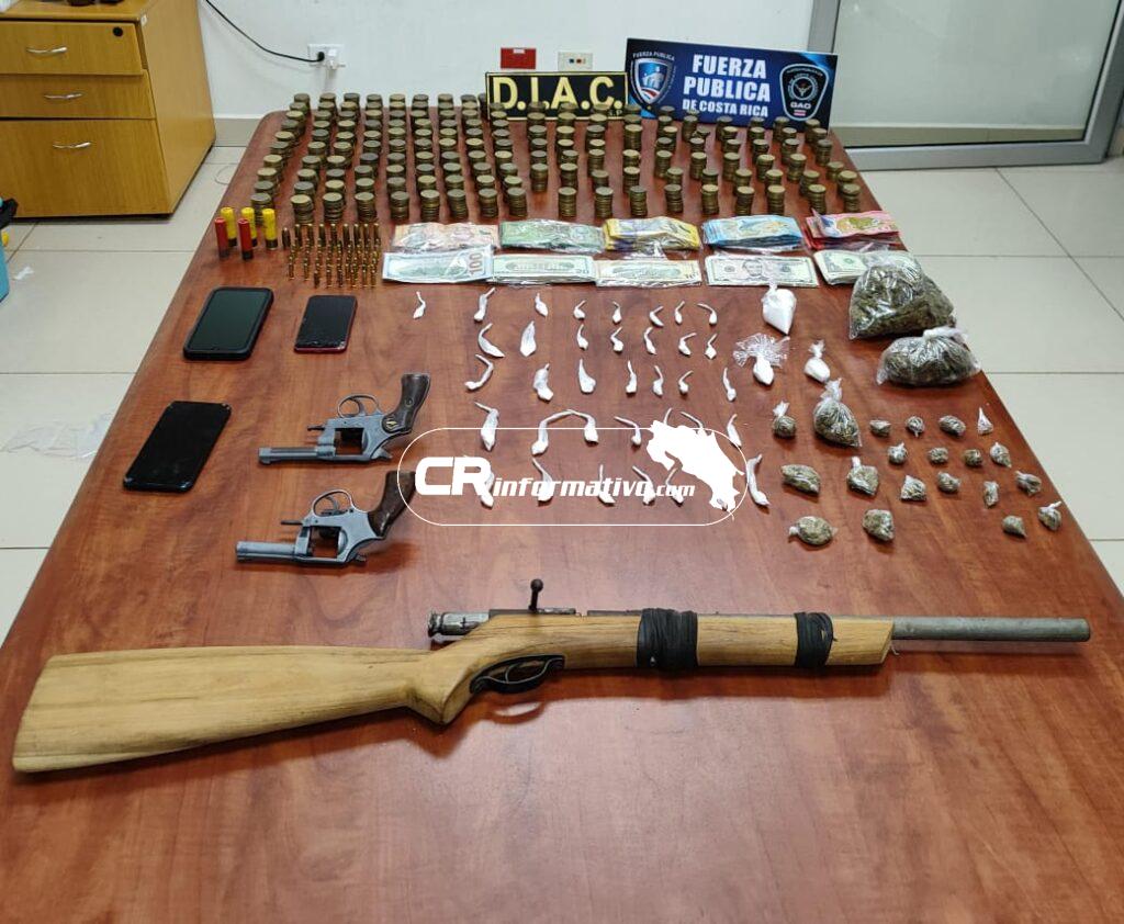 Los oficiales incautaron en total un revólver, una escopeta artesanal, una pistola y 62 municiones. Además, 226 gramos de marihuana, 37.8 gramos de pasta de cocaína, 566 125 colones y 1120 dólares americanos.