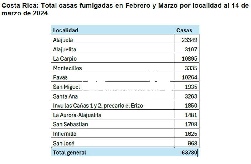 El pasado 19 de febrero, el Ministerio de Salud a través del Programa de Control de Vectores inició una estrategia para combatir el dengue en zonas específicas del cantón central de San José y el cantón central de Alajuela con el objetivo de sensibilizar a la población sobre el papel fundamental que desempeñan en la lucha contra la transmisión de la enfermedad, esta estrategia finalizó el 14 de marzo y se fumigaron un total de 63,780 casas.