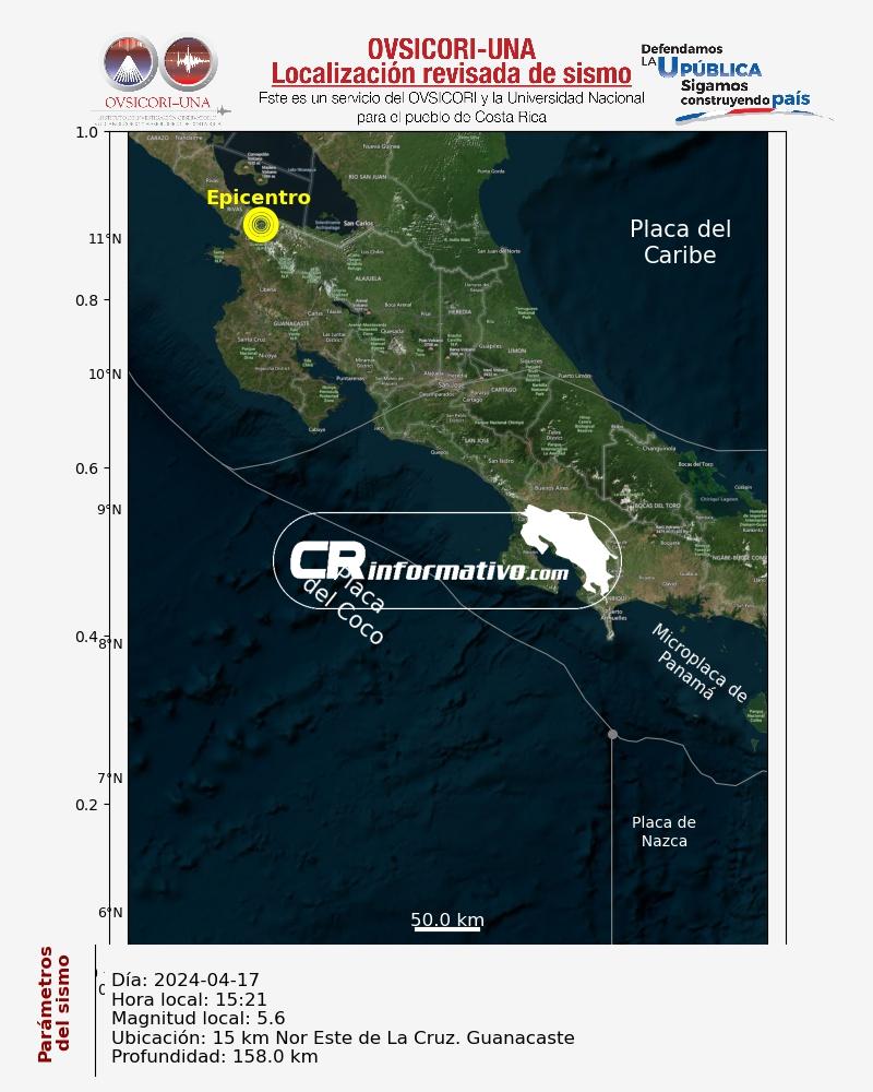Aproximadamente a las 17:15 pm, un sismo de considerable magnitud estremeció gran parte del territorio costarricense, según reportes proporcionados por los residentes locales. La Red Sismológica Nacional (RSN) ha confirmado que el sismo alcanzó una Magnitud: 5.6 en la escala de Richter, con su epicentro ubicado en la cruz de Guanacaste de Costa Rica