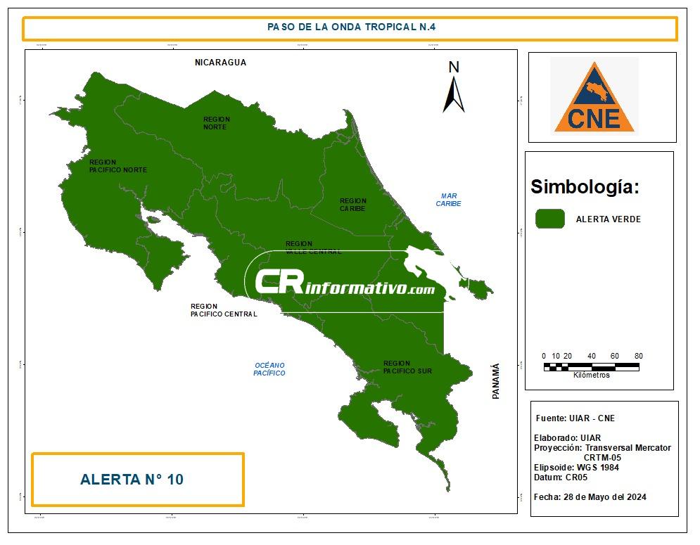 (Aviso Meteorológico Onda Tropical #4 acercándose al país 28 de mayo de 2024 9:00 a.m.) Según el IMN, la onda tropical estará centrada en nuestro país este miércoles muy temprano, pero sus efectos se empezarán a sentir de forma paulatina desde este martes (28 de mayo) en el Caribe Norte y Zona Norte, con aumento de nubosidad inicialmente y luego con lluvias variables. La modelación numérica muestra mayor actividad lluviosa en estas regiones durante avanzada la noche del martes y la madrugada del miércoles.