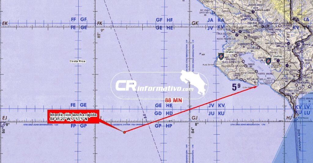 Tras ser informado el Guardacostas sobre la presencia de la embarcación sospechosa en aguas de nuestro país, de forma inmediata zarpó una embarcación interceptora con oficiales de los GOPES, quienes lograron detener dicha lancha a 88 millas náuticas (163 kilómetros) del Golfo Dulce.