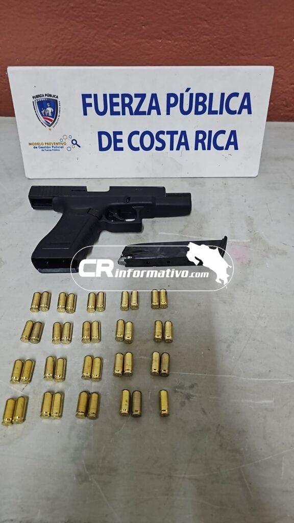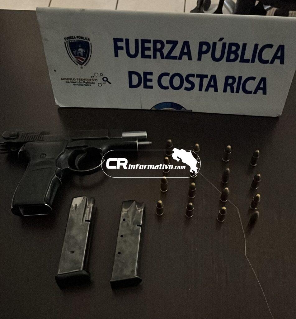 También durante la noche del sábado, la Fuerza Pública encontró un arma menos letal, calibre 9 m.m a bordo de un vehículo, el cual fue abordado durante un control de carreteras realizado en el sector de Rancho Guanacaste, en el distrito de Hatillo.