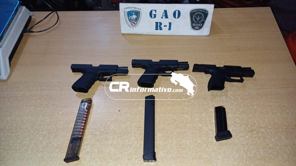 Siempre en Desamparados, durante esta madrugada varios oficiales fueron despachados para atender un incidente presentado durante una fiesta que tenía lugar dentro de una vivienda ubicada en la urbanización Loto 2, por lo que al llegar los policías encontraron dentro del inmueble tres pistolas calibre 9 m.m, una de ellas con el número de serie limada y las otras dos sin inscribir.