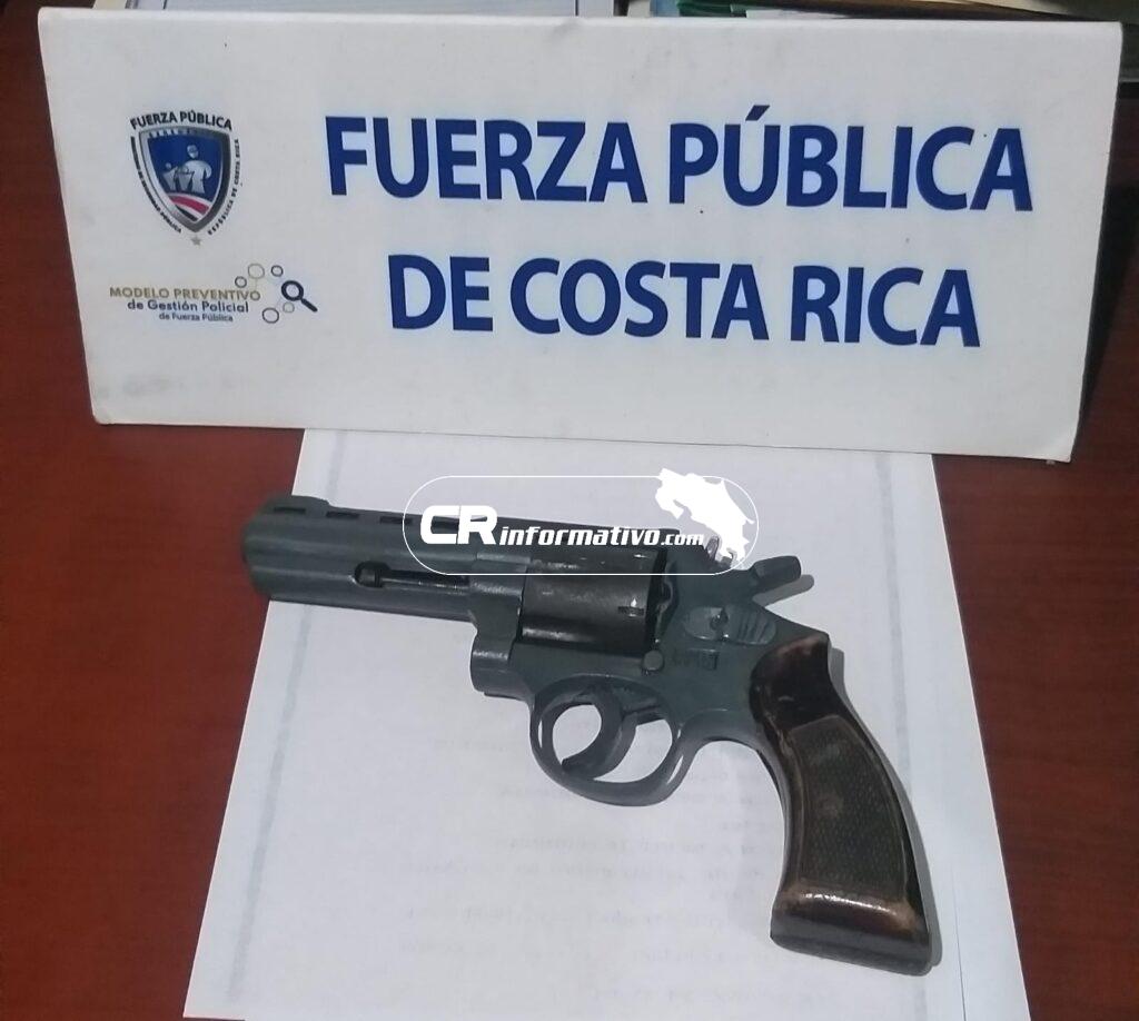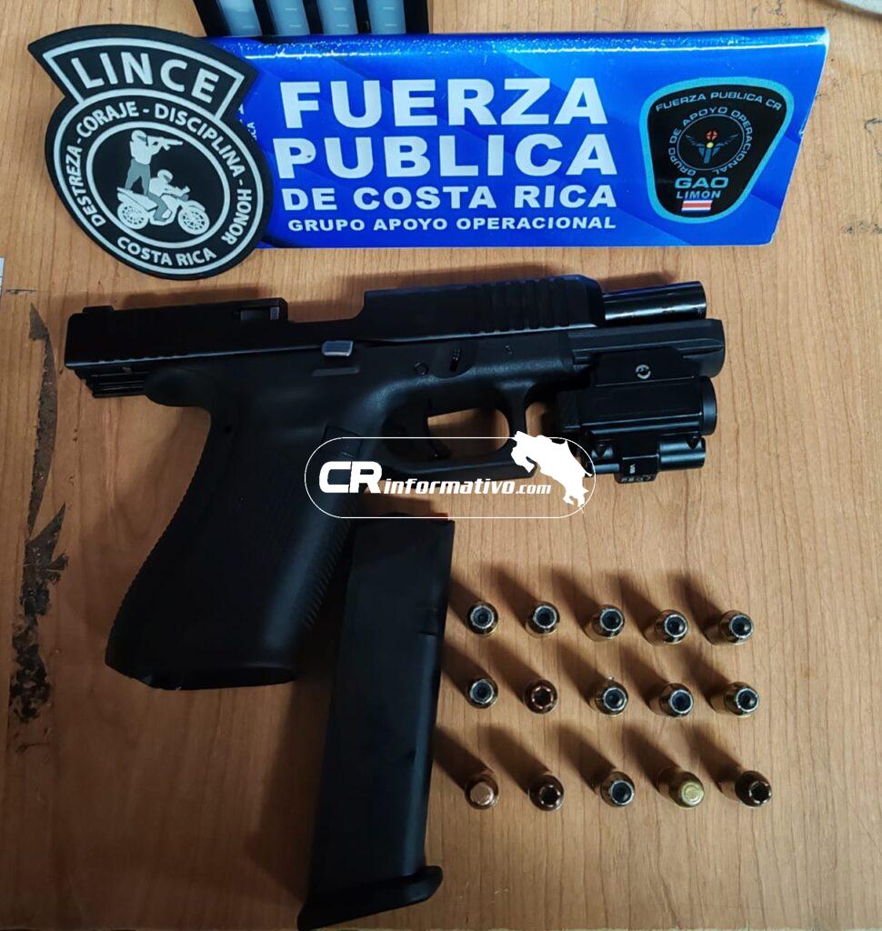 Siempre en el distrito central de Limón, la Fuerza Pública decomisó esta madrugada una pistola calibre 22 y 15 proyectiles a un conductor con antecedentes por lesiones leves, el cual se desplazaba de manera sospechosa por las calles del barrio Limoncito.