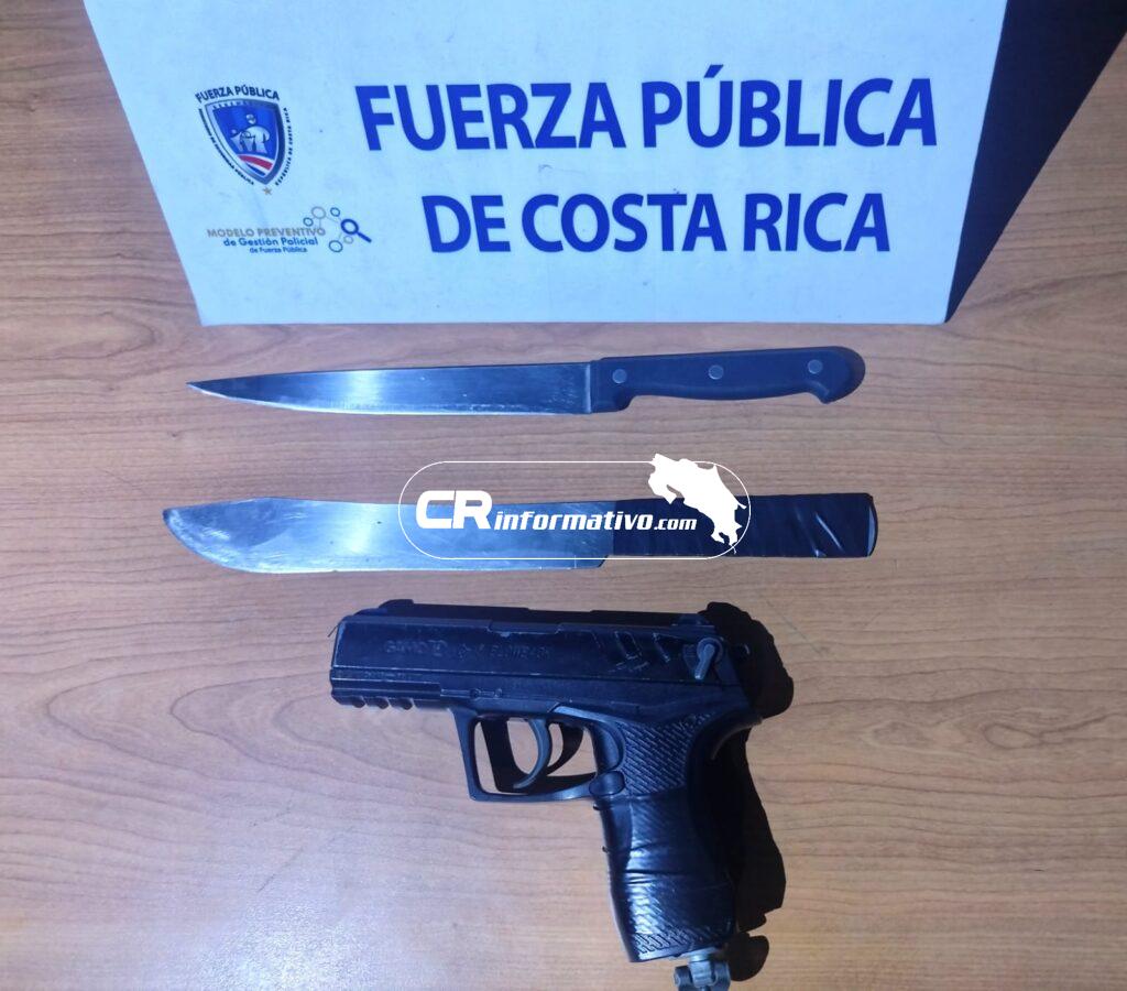 A los sujetos se les decomisó un arma menos letal y un arma blanca, ambos quedaron a la orden de la Fiscalía de Flagrancia de Alajuela.