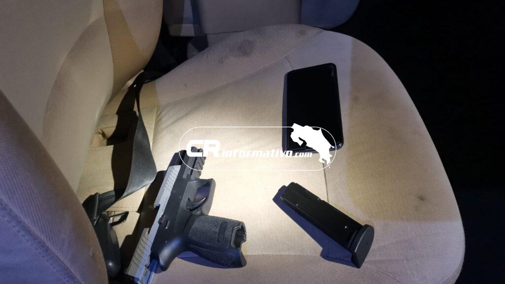 Minutos después, otro vehículo ingreso a esta propiedad y su conductor al notar la presencia policial se dio a la fuga, por lo que se solicitó apoyo del Grupo de Apoyo Operacional (GAO) quienes lograron detenerlo y arrestar a cuatro sujetos, uno de ellos portaba un arma menos letal y, además, llevaban una cizalla y varias pichingas con combustible.