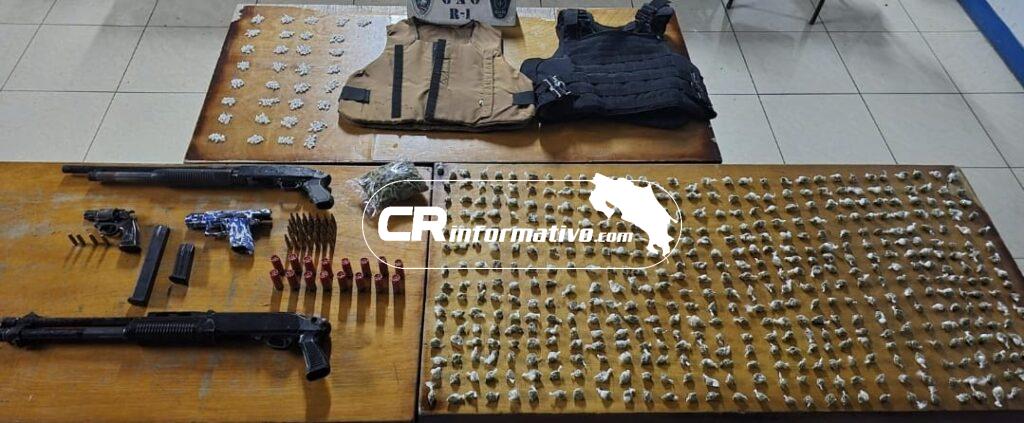 Se trató de un total de 660 dosis de aparente crack, 497 dosis y 100 gramos de aparente marihuana, así como dos escopetas, un revólver y una pistola, 50 municiones y dos chalecos balísticos.