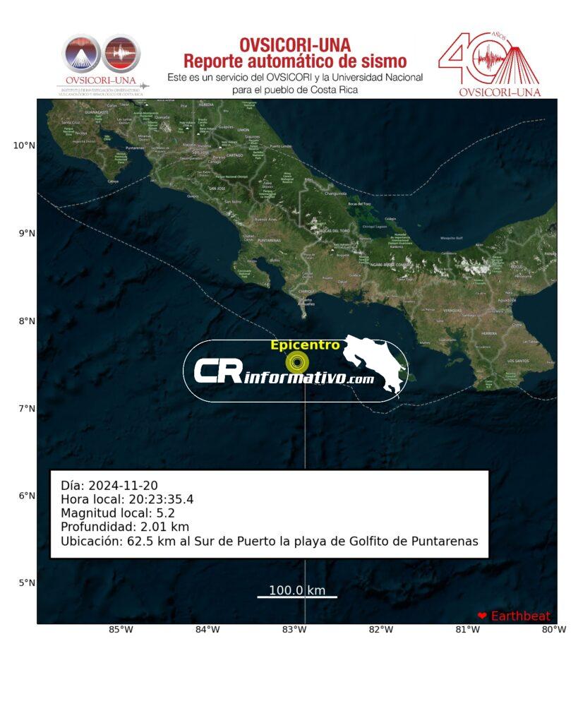 De acuerdo con la Red Sismológica Nacional (RSN), el evento se registró a las 8:23 pm, con su epicentro ubicado a 17 kilómetros al oeste de Punta Burica, cerca de la frontera con Panamá.
