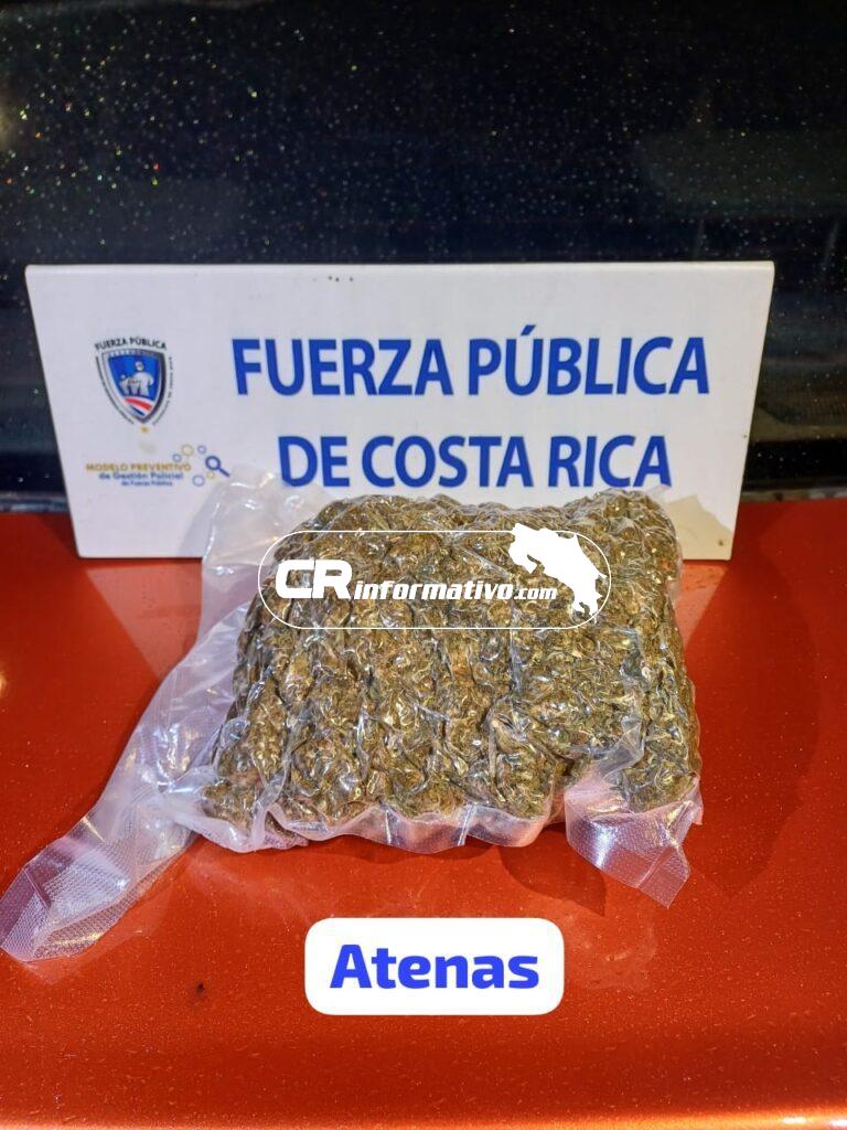 La Fuerza Pública incautó más de 1 kilo de marihuana durante un control vehicular en la Ruta 27, específicamente en la entrada de Escobal, Atenas. Los operativos, realizados en dos intervenciones independientes, resultaron en la detención de cuatro personas.