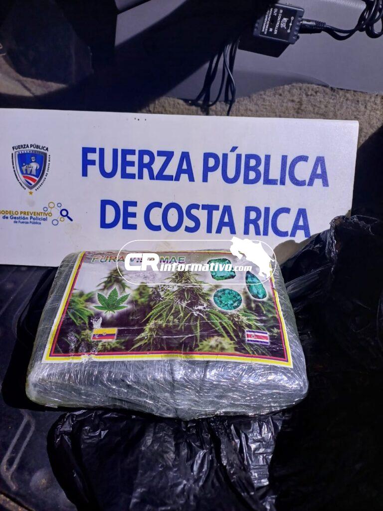 En el primer caso, oficiales de Atenas y Orotina, en un trabajo conjunto, detuvieron a un hombre de apellido Lobo y una mujer de apellido Arauz. Durante la inspección, encontraron 535 gramos de marihuana empaquetados en una bolsa plástica negra con una etiqueta que decía “Pura Vida”.