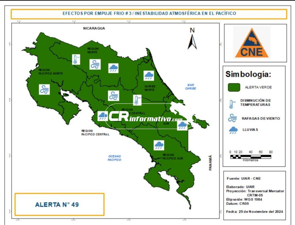 La Comisión Nacional de Prevención de Riesgos y Atención de Emergencias (CNE) emitió este viernes un aviso oficial en el que se amplía la ALERTA VERDE para todo el territorio nacional debido a las condiciones meteorológicas actuales y la proximidad del Empuje Frío #3.
