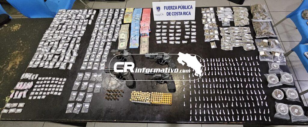 Durante la intervención decomisaron cuatro revólveres calibre 38 en posesión de dos de los sujetos. Además, el tercer detenido portaba un bolso que contenía una significativa cantidad de aparentes drogas, como marihuana, cocaína, heroína, crack, LSD, hachís, tusi y múltiples envoltorios.