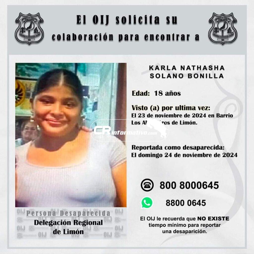 Esta mujer habría sido reportada como desaparecida el domingo 24 de noviembre del presente año, quien habría sido vista por última vez un día antes en Barrio Los Almedros de Limón.