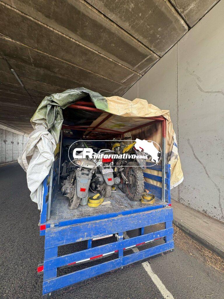 Durante un control de carretera en el sector del Puente Pozón, Orotina, las autoridades lograron la aprehensión de un sujeto de apellido Mora, quien conducía un camión cargado con seis bicimotos y tres motocicletas con alteraciones en sus señas y marcas.