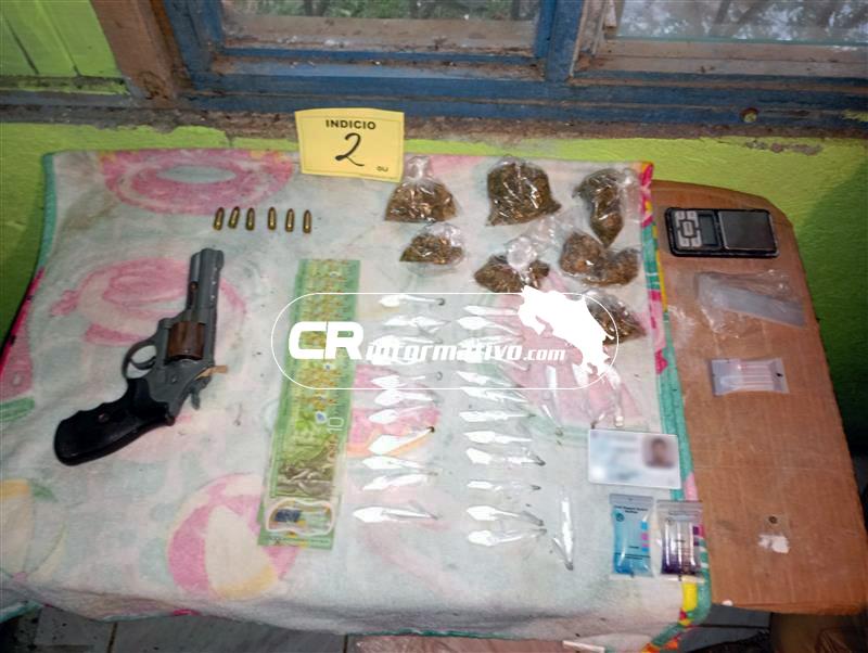 Durante el registro del inmueble, se lograron ubicar varias dosis de aparente droga tipo marihuana y cocaína, además, de un arma de fuego por lo que se procedió a la detención de un masculino de 20 años, por el aparente delito de Infracción a la Ley de Psicotrópicos.