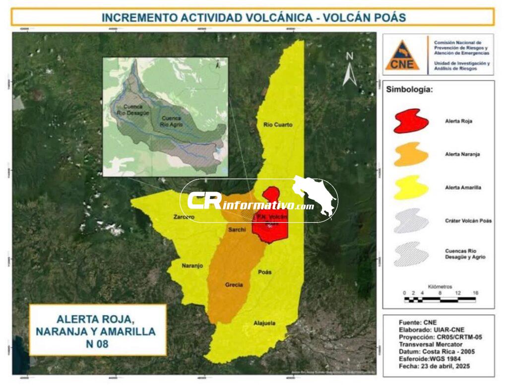 vigentes:Alerta Roja: Parque Nacional Volcán Poás (acceso restringido).Alerta Naranja: Cantones de Sarchí y Grecia.Alerta Amarilla: Poás, Alajuela, Naranjo y Río Cuarto.