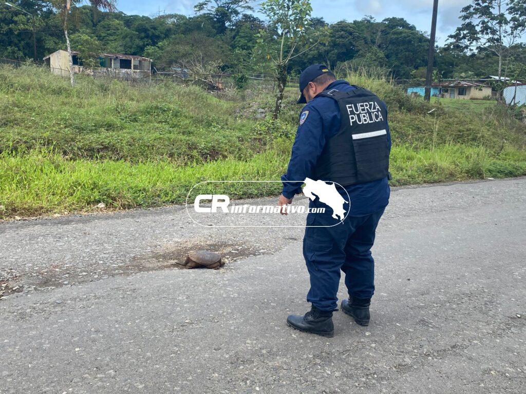 Según lo informado por el jefe distrital de la Fuerza Pública de Dos Ríos de Upala, frontera norte, subintendente Fausto López, los policías, al notar que la tortuga caminaba lentamente por una de las vías principales de la comunidad, optaron por trasladarla hasta el otro lado de la calle y colocarla en una pequeña quebrada.
